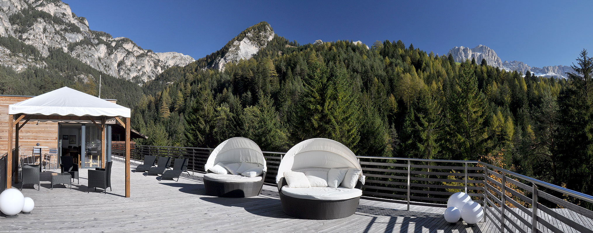 Unser Haus verfügt über einen Licht durchfluteten, geräumigen Speisesaal, von dem aus man direkt auf die Sonnenterrasse gelangt. Wir haben eine gut sortierte Weinecke mit erlesenen Genüssen aus nahe gelegenen Südtiroler Weingütern. Einige typisch italienische Weine runden unser breit gefächertes Angebot ab. An unserer einladenden Theke verweilt man gerne auf ein erfrischendes Bier nach dem Wandern oder ein Gläschen Wein am Abend. Ein Aufenthaltsraum mit 85" Fernseher, vor allem für wichtige Sportübertragungen, sowie ein Internetpoint stehen zur Verfügung. Eine hauseigene umfangreiche Bibliothek ist für Musestunden genau das Richtige. Im Spielraum kann man sich bei Tischtennis, Billard, Tischfußball, Airhockey und Darts sportlich betätigen, ebenso im Fitnessraum an verschiedenen Geräten oder in unserem 10m hohen Kletterturm. Entspannen kann man in einem unserer Whirlpools, in der Infrarotkabine oder in den Saunen.